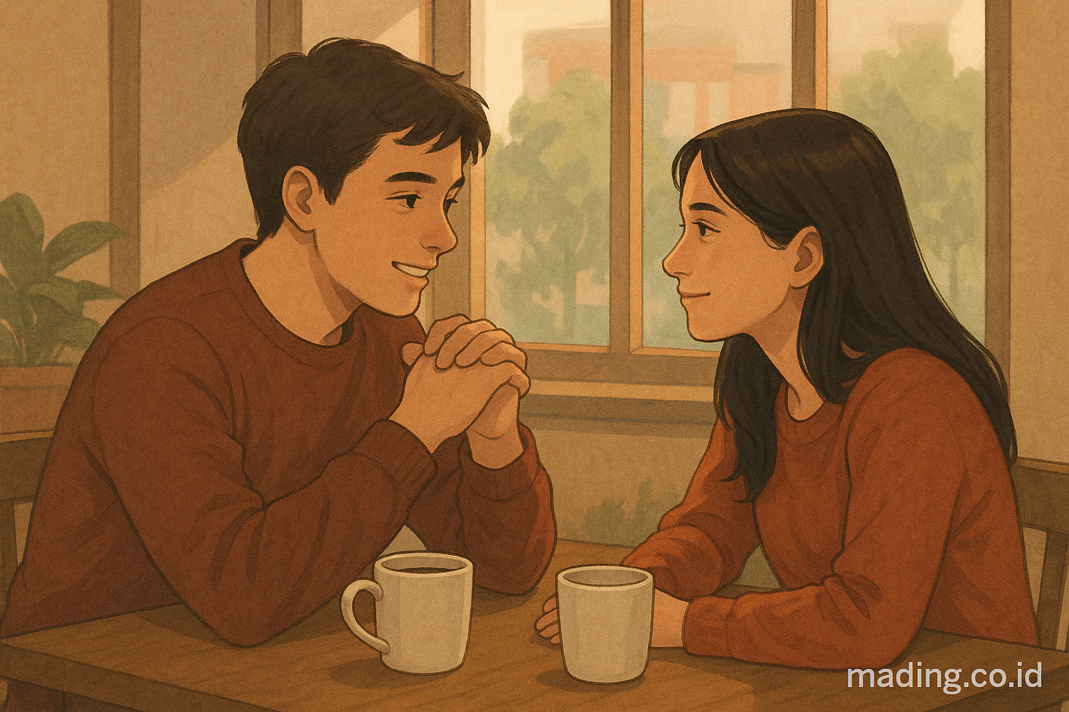 Keesokan harinya, mereka bertemu di sebuah kafe kecil dekat kampus. Raka duduk berhadapan dengan Dara, tangannya sedikit gemetar. Kopi di depannya tidak disentuh, karena yang membuatnya benar-benar berdebar bukanlah kafein.
