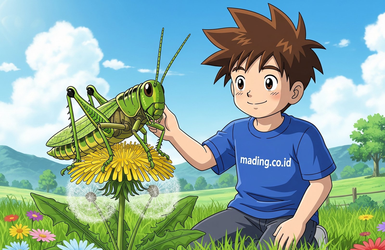 “Hei, kamu mau kemana?” tanya Raka sambil mengulurkan tangan. Ajaibnya, belalang itu tidak melompat menjauh. Ia malah berhenti dan perlahan naik ke telapak tangan Raka.